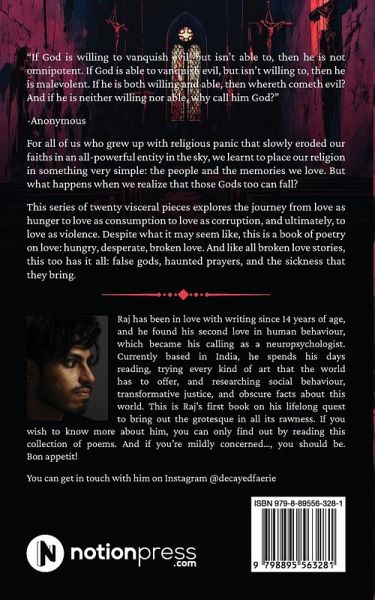 "If God is willing to vanquish evil, but isn't able to, then he is not omnipotent. If God is able to vanquish evil, but isn't willing to, then he is malevolent. If he is both willing and able, then whereth cometh evil? And if he is neither willing nor able, why call him God?" -Anonymous For all of us who grew up with religious panic that slowly eroded our faiths in an all-powerful entity in the sky, we learnt to place our religion in something very simple: the people and the memories we love. But what happens when we realize that those Gods too can fall? This series of twenty visceral pieces and fifty-five exclusive digital artworks meticulously sketched by the author explores the journey from love as hunger to love as consumption to love as corruption, and ultimately, to love as violence. This is not just a book of poetry; it is a visual and emotional experience: of hungry, desperate, broken love. And like all broken love stories, this too has it all: false gods, haunted prayers, and the sickness that they bring.