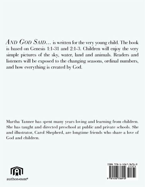 And God Said... is written for the very young child. The book is based on Genesis 1:1-31 and 2:1-3. Children will enjoy the very simple pictures of the sky, water, land and animals. Readers and listeners will be exposed to the changing seasons, ordinal numbers, and how everything is created by God.