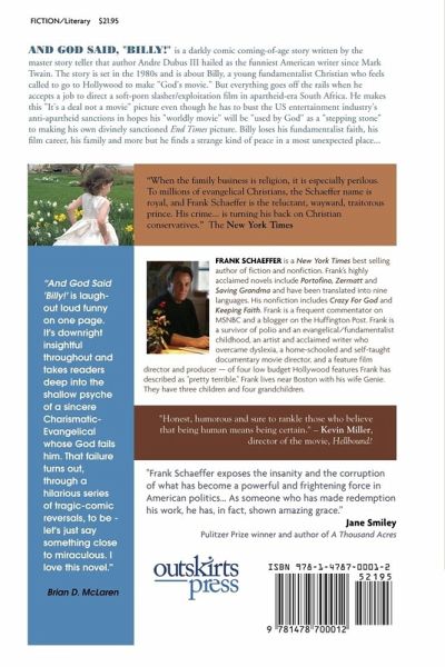 From the New York Times bestselling author of Crazy For God... "And God Said 'Billy!' is laugh-out loud funny from page one. It's downright insightful throughout and takes readers deep into the shallow psyche of a sincere Charismatic-Evangelical whose God fails him. That failure turns out, through a hilarious series of tragic-comic reversals, to be - let's just say something close to miraculous. I love this novel." -- Brian D. McLaren, author/speaker/blogger. "Honest, humorous and sure to rankle those who believe that being human means being certain." -- Kevin Miller director of "Hellbound?" the movie. "When the family business is religion, it is especially perilous. To millions of evangelical Christians, the Schaeffer name is royal, and Frank Schaeffer is the reluctant, wayward, traitorous prince. His crime... is turning his back on Christian conservatives." The New York Times. "Frank Schaeffer exposes the insanity and the corruption of what has become a powerful and frightening force in American politics... As someone who has made redemption his work, he has, in fact, shown amazing grace." -- Jane Smiley Pulitzer Prize winner and author of A Thousand Acres. And God Said, "Billy!" is a darkly comic coming-of-age story written by the master story teller that House of Sand and Fog author Andre Dubus III hailed as the funniest American writer since Mark Twain. The story is set in the 1980s and is about Billy, a young fundamentalist Christian who feels called to go to Hollywood to make "God's movie." But everything goes off the rails when he accepts a job to direct a soft-porn slasher/exploitation film in apartheid-era South Africa. He makes this "It's a deal not a movie" picture even though he has to bust the US entertainment industry's anti-apartheid sanctions in hopes his "worldly movie" will be "used by God" as a "stepping stone" to making his own divinely sanctioned "End Times" picture. Billy loses his fundamentalist faith, his film career, his family and mo