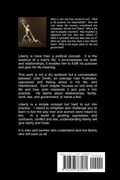 Liberty is more than a political concept. It is the essence of a man's life, it encompasses his work and relationships, it enables him to fulfill his purpose and gives his life meaning. This work is not a dry textbook but a conversation between John Smith, an average man frustrated, oppressed and flailing about in his life, and Hashticharot. Each chapter focuses on one area of life and how John interprets it and puts it into practice. He learns about relationships, family, work, law, religion and government, to name a few. Liberty is a simple concept but it is hard to put into practice. I intend to enlighten and challenge you to learn to live the way men and women were meant to live. In a world of growing oppression and confusion, conflict and lies, understanding liberty will give clarity and hope. It is men and women who understand and live liberty who will save us all.
