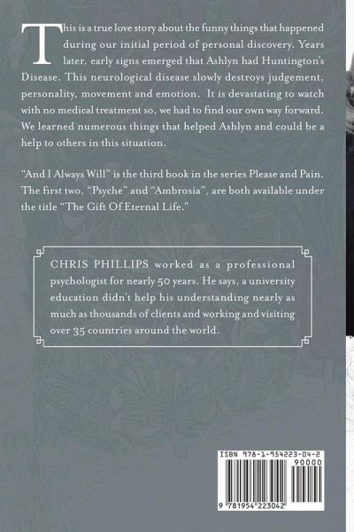 This is a true love story about the funny things that happened during our initial period of personal discovery. Years later, early signs emerged that Ashlyn had Huntington's Disease. This neurological disease slowly destroys judgement, personality, movement and emotion. It is devastating to watch with no medical treatment so, we had to find our own way forward. We learned numerous things that helped Ashlyn and could be a help to others in this situation. "And I Always Will" is the third book in the series Please and Pain. The first two, "Psyche" and "Ambrosia", are both available under the title "The Gift Of Eternal Life."