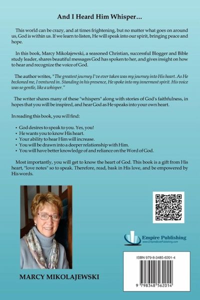 Marcy Mikolajewski is a seasoned Christian, successful blogger and bible study leader. She makes her home in Ohio, enjoying life as a wife, mother and grandmother. She has worked in ministry and also the business world and takes her faith wherever she goes. Her blog messages touch the lives of many people, as she seeks to reveal the heart of God. Her love for Jesus abounds and is her reason for writing. Marcy has a strong belief that God wants to speak to all of His children. She refers to this inner voice of God as a whisper. During private intimate times with her Father and Savior, Marcy received and journaled many of these "whispers" and shares them now, encouraging others to listen for His voice into their own heart. Her Book, "And I Heard Him Whisper" is a devotional of heavenly messages, inspiring pictures, and stories of God's faithfulness. Marcy writes, "It is my desire that as you read, you will be drawn closer into His amazing heart!"
