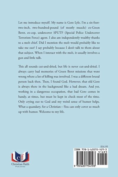Let me introduce myself. My name is Gore Lyle. I’m a six-foot-two-inch, two-hundred-pound (of mostly muscle) ex-Green Beret, ex-cop, undercover SPUTF (Special Police Undercover Terrorism Force) agent. I also am independently wealthy thanks to a mob chief. Did I mention the mob would probably like to take me out? I say probably because I don’t talk to them about that subject. When I interact with the mob, it usually involves a gun and little talk. This all sounds cut-and-dried, but life is never cut-and-dried. I always carry bad memories of Green Beret missions that went wrong where a lot of killing was involved. I was a different brutal person back then. Then, I found God. However, that old Gore is always there in the background like a bad dream. And yet, working in a dangerous occupation, that bad Gore comes in handy, at times, but must be kept in check most of the time. Only crying out to God and my weird sense of humor helps. What a quandary, for a Christian—You can only cover so much up with humor. Welcome to my life.
