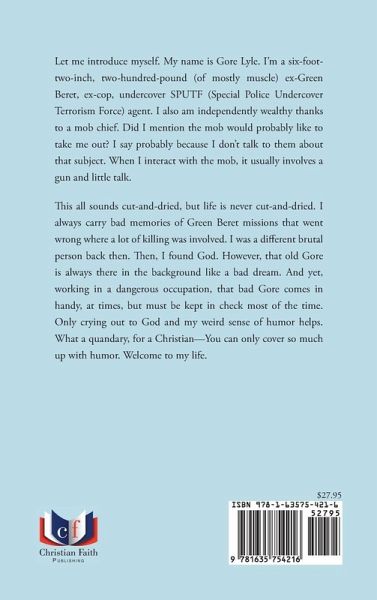 Let me introduce myself. My name is Gore Lyle. I’m a six-foot-two-inch, two-hundred-pound (of mostly muscle) ex-Green Beret, ex-cop, undercover SPUTF (Special Police Undercover Terrorism Force) agent. I also am independently wealthy thanks to a mob chief. Did I mention the mob would probably like to take me out? I say probably because I don’t talk to them about that subject. When I interact with the mob, it usually involves a gun and little talk. This all sounds cut-and-dried, but life is never cut-and-dried. I always carry bad memories of Green Beret missions that went wrong where a lot of killing was involved. I was a different brutal person back then. Then, I found God. However, that old Gore is always there in the background like a bad dream. And yet, working in a dangerous occupation, that bad Gore comes in handy, at times, but must be kept in check most of the time. Only crying out to God and my weird sense of humor helps. What a quandary, for a Christian—You can only cover so much up with humor. Welcome to my life.