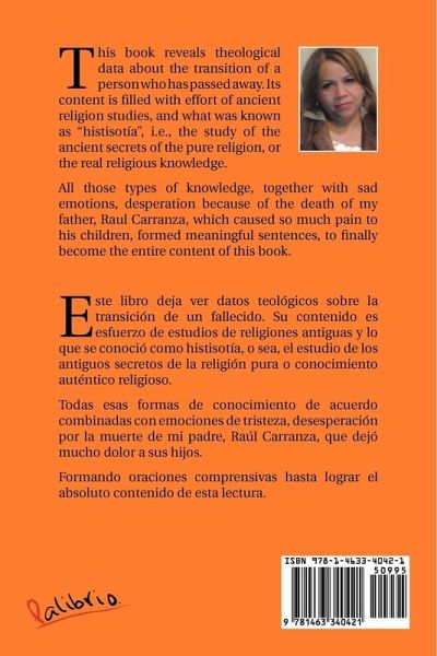 Este libro deja ver datos teológicos sobre la transición de un fallecido. Su contenido es esfuerzo de estudios de religiones antiguas y lo que se conoció como histisotía, o sea, el estudio de los antiguos secretos de la religión pura o conocimiento auténtico religioso. Todas esas formas de conocimiento de acuerdo combinadas con emociones de tristeza, desesperación por la muerte de mi padre, Raúl Carranza, que dejó mucho dolor a sus hijos. Formando oraciones comprensivas hasta lograr el absoluto contenido de esta lectura. This book reveals theological data about the transition of a person who has passed away. Its content is filled with effort of ancient religion studies, and what was known as "histisotía", i.e., the study of the ancient secrets of the pure religion, or the real religious knowledge. All those types of knowledge, together with sad emotions, desperation because of the death of my father, Raul Carranza, which caused so much pain to his children, formed meaningful sentences, to finally become the entire content of this book.