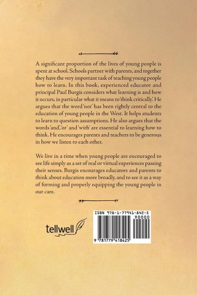 A significant proportion of the lives of young people is spent at school. Schools partner with parents, and together they have the very important task of teaching young people how to learn. In this book, experienced educator and principal Paul Burgis considers what learning is and how it occurs, in particular what it means to 'think critically'. He argues that the word 'not' has been rightly central to the education of young people in the West. It helps students to learn to question assumptions. He also argues that the words 'and', 'or' and 'with' are essential to learning how to think. He encourages parents and teachers to be generous in how we listen to each other. We live in a time when young people are encouraged to see life simply as a set of real or virtual experiences passing their senses. Burgis encourages educators and parents to think about education more broadly, and to see it as a way of forming and properly equipping the young people in our care.