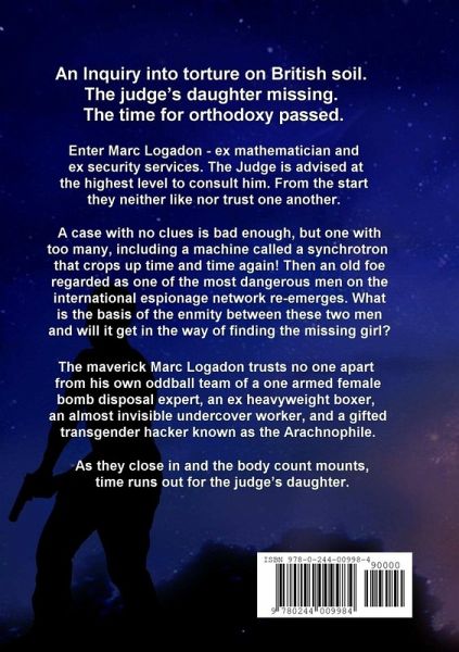 An Inquiry into torture on British soil. The judge's daughter missing. The time for orthodoxy passed. Enter Marc Logadon - ex mathematician and ex security services. The Judge is advised at the highest level to consult him. From the start they neither like nor trust one another. A case with no clues is bad enough, but one with too many, including a machine called a synchrotron that crops up time and time again! Then an old foe regarded as one of the most dangerous men on the international espionage network re-emerges. What is the basis of the enmity between these two men and will it get in the way of finding the missing girl? The maverick Marc Logadon trusts no one apart from his own oddball team of a one armed female bomb disposal expert, an ex heavyweight boxer, an almost invisible undercover worker, and a gifted transgender hacker known as the Arachnophile. As they close in and the body count mounts, time runs out for the judge's daughter.