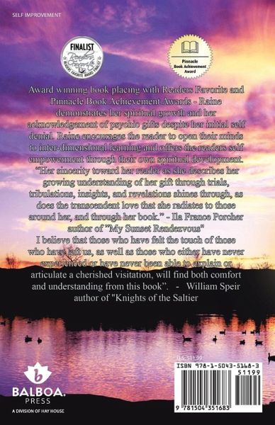 Award winning book placing with Readers Favorite and Pinnacle Book Achievement Awards - Raine demonstrates her spiritual growth and her acknowledgement of psychic gifts despite her initial self denial. Raine encourages the reader to open their minds to inter-dimensional learning and offers the readers self empowerment through their own spiritual development. "Her sincerity toward her reader as she describes her growing understanding of her gift through trials, tribulations, insights, and revelations shines through, as does the transcendent love that she radiates to those around her, and through her book." - Ila France Porcher author of "My Sunset Rendezvous" I believe that those who have felt the touch of those who have left us, as well as those who either have never experienced or have never been able to explain or articulate a cherished visitation, will find both comfort and understanding from this book". - William Speir author of "Knights of the Saltier