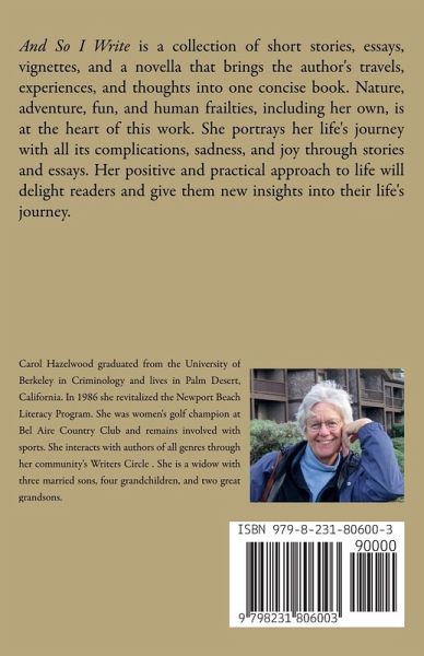 And So I Write is a collection of short stories, essays, vignettes, and a novella that brings the author's travels, experiences, and thoughts into one concise book. Nature, adventure, fun, and human frailties, including her own, is at the heart of this work. She portrays her life's journey with all its complications, sadness, and joy through stories and essays. Her positive and practical approach to life will delight readers and give them new insights into their life's journey.