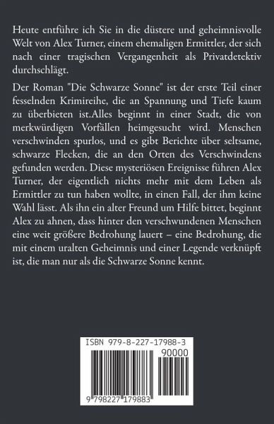 Heute entführe ich Sie in die düstere und geheimnisvolle Welt von Alex Turner, einem ehemaligen Ermittler, der sich nach einer tragischen Vergangenheit als Privatdetektiv durchschlägt. Der Roman "Die Schwarze Sonne" ist der erste Teil einer fesselnden Krimireihe, die an Spannung und Tiefe kaum zu überbieten ist.Alles beginnt in einer Stadt, die von merkwürdigen Vorfällen heimgesucht wird. Menschen verschwinden spurlos, und es gibt Berichte über seltsame, schwarze Flecken, die an den Orten des Verschwindens gefunden werden. Diese mysteriösen Ereignisse führen Alex Turner, der eigentlich nichts mehr mit dem Leben als Ermittler zu tun haben wollte, in einen Fall, der ihm keine Wahl lässt. Als ihn ein alter Freund um Hilfe bittet, beginnt Alex zu ahnen, dass hinter den verschwundenen Menschen eine weit größere Bedrohung lauert - eine Bedrohung, die mit einem uralten Geheimnis und einer Legende verknüpft ist, die man nur als die Schwarze Sonne kennt.