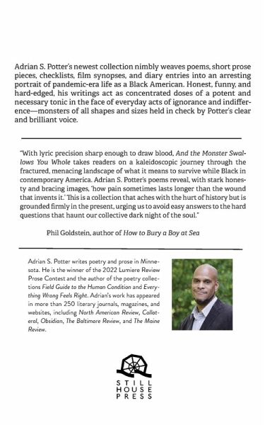 Adrian S. Potter's newest collection nimbly weaves poems, short prose pieces, checklists, film synopses, and diary entries into an arresting portrait of pandemic-era life as a Black American. Honest, funny, and hard-edged, his writings act as concentrated doses of a bracing and necessary tonic in the face of everyday acts of ignorance and indiff er- ence-monsters of all shapes and sizes held in check by Po er's clear and brilliant voice.