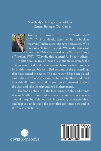 Somebody's playing a game with us. -General Beringer, War Games During the course of the SARS-nCoV-2/COVID-19 pandemic, described in this book as "the event," many questions have been asked. Who is responsible for this event? Where did this virus come from? What happened in the Wuhan Institute of Virology (WIV)? Why did this happen? And many others. In this book, many of these questions are answered, the dots are connected, and the navigation buoys anchored to steer by in this most terrible fact-filled account of the proceedings that have caused the event. The entire world has been played and is the victim of crimes against humanity. Read and learn how this all transpired, and do your own homework. Follow the path and take the trip outlined in these pages. The book delves into the locations, people, and events that are headline stories and have made an impact on so many around the globe. This book will inform you, make you think, and help you understand the event that continues now and in the foreseeable future.