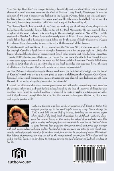 "And the Sky Was Clean" is a compelling story; beautifully written about life on the windswept shores of a small southern town on the Gulf of Mexico; Long Beach, Mississippi. It was the summer of '69 that a monster was lurking in the Atlantic Ocean, biding her time and growing like a fast spreading cancer. Her name was Camille. She would be dubbed "the storm of a lifetime"; devastating the entire Gulf Coast and a way of life beloved by all. The Gervais' family, like so much of the Coast, is a melting pot of cultures. Gene, the patriarch hailed from the beautiful land of lakes in far off St. Paul Minnesota. He met married Ida, a daughter of the south, whose roots run deep in the Mississippi mud after World War II while stationed at Keesler Air Force Base in the nearby town of Biloxi. Later, their youngest, Cathy would fall in love with a handsome young Biloxi boy by the name of Ricky Suarez who's Cajun French and Spanish ancestry is forever linked with the sea and all her bounty. While the south endured times of civil unrest and the Vietnam War, it also was forced to suffer through Camille, a level five catastrophic hurricane on a hot August night in 1969; who forever changed the standard of measurement for all other storms that rolled ashore thereafter. Then in 2005, the storm of all storms: hurricane Katrina made Camille look as though it were a mere warm up performance for the main act. It's been said that hurricane Camille killed more people in 2005 than she did in 1969, due to the local attitudes that espoused her as the icon of all storms, the tempest that would surely never come to pass again! As New Orleans took center stage in the national news, the fact that Mississippi bore the brunt of Katrina's wrath was lost to a nation glued to events unfolding in the Crescent City. Countless small villages and communities across Mississippi were plunged into darkness, cut off from the rest of the world; struggling to survive the elements! Life and the effects of these two catastrophic events are told in this compelling story based on the events as they unfolded with both families, bound by the love of their two children for one another. Each family is touched and forever changed by their struggles and triumphs as Cathy and Ricky discover through their faith in God that no matter how great the battle; God's love and hope is greater still!