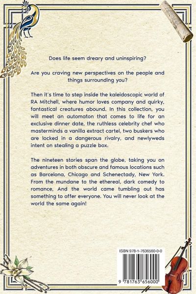 Does life seem dreary and uninspiring? Are you craving new perspectives on the people and things surrounding you? Then it's time to step inside the kaleidoscopic world of RA Mitchell, where humor loves company and quirky, fantastical creatures abound. In this collection, you will meet an automaton that comes to life for an exclusive dinner date, the ruthless celebrity chef who masterminds a vanilla extract cartel, two buskers who are locked in a dangerous rivalry, and newlyweds intent on stealing a puzzle box. The nineteen stories span the globe, taking you on adventures in both obscure and famous locations such as Barcelona, Chicago and Schenectady, New York. From the mundane to the ethereal, dark comedy to romance, And the world came tumbling out has something to offer everyone. You will never look at the world the same again!