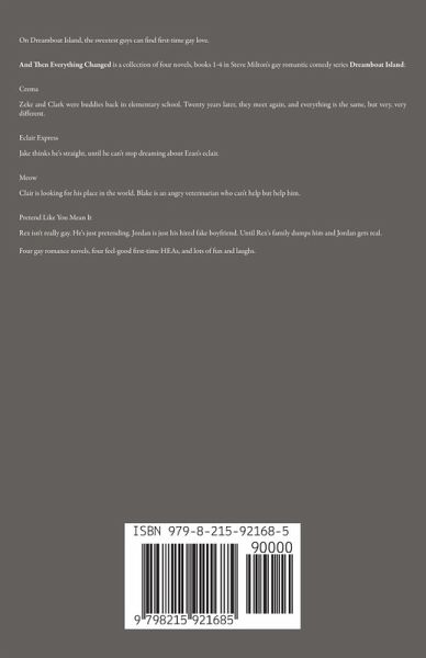 On Dreamboat Island, the sweetest guys can find first-time gay love. And Then Everything Changed is a collection of four novels, books 1-4 in Steve Milton's gay romantic comedy series Dreamboat Island: Crema Zeke and Clark were buddies back in elementary school. Twenty years later, they meet again, and everything is the same, but very, very different. Eclair Express Jake thinks he's straight, until he can't stop dreaming about Eran's eclair. Meow Clair is looking for his place in the world. Blake is an angry veterinarian who can't help but help him. Pretend Like You Mean It Rex isn't really gay. He's just pretending. Jordan is just his hired fake boyfriend. Until Rex's family dumps him and Jordan gets real. Four gay romance novels, four feel-good first-time HEAs, and lots of fun and laughs.