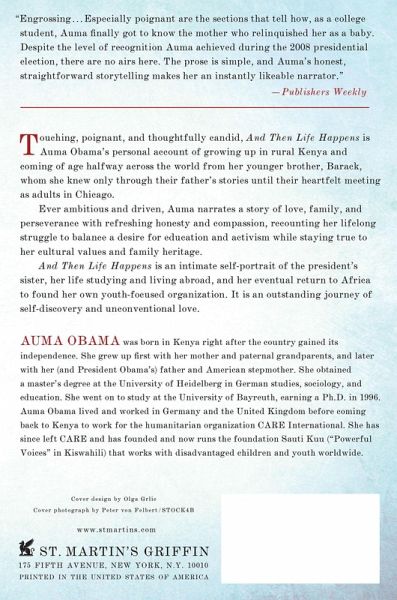 President Barack Obama's sister's moving memoir of her life in Africa and Europe, and her relationship with her brother. In this candid and emotional memoir, Auma shares her own story as well as recollections of and experiences with her famous brother, who says about their first encounter: I hugged her, we looked at each other, and laughed. I knew right then that I loved her.
