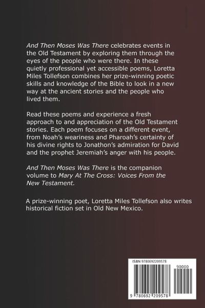 And Then Moses Was There celebrates events in the Old Testament by exploring them through the eyes of people who were there. In these quietly accessible poems, Loretta Miles Tollefson combines her award-winning poetic skills and knowledge of the Bible to look in a new way at the ancient stories and the people who lived them. Read these poems and experience a fresh approach to and appreciation of the Old Testament stories. Each poem focuses on a different event, from Noah's weariness and Pharoah's certainty of his divine rights to Jonathon's admiration for David and the prophet Jeremiah's anger with his people. And Then Moses Was There is the companion volume to Mary At The Cross: Voices From the New Testament.