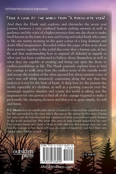 Take a look at the world from "a birds-eye view"... And then the Hawk said...explores and chronicles the seven year journey between a very confused human seeking answers as well as guidance and the voice of a higher presence that one day chose to make itself known in the form of a wise and loving red tailed hawk who came to life one wintry morning in the quiet corner of a long dormant and doubt filled imagination. Revealed within the pages of this story about their journey together is the joyful discovery that a human can, in fact fly and that understanding how to suspend all disbelief in regards to what one has been conditioned to believe about themselves as well as what they are capable of creating and being can open the doors to endless possibilities in life. The Hawk patiently explains how to find the courage to walk away from the endless noise of the outside world and accept the wisdom of the often ignored but always patient voice of one's true self while intuitively cautioning along the way that this endeavor is not for the faint of heart. A deep love for the present-day world, especially it's children, as well as a growing concern over the seemingly negative mindset and course the world is taking was the inspiration for one person to find all of the courage required to make a profoundly life changing decision and that was to quite simply...be still and listen.