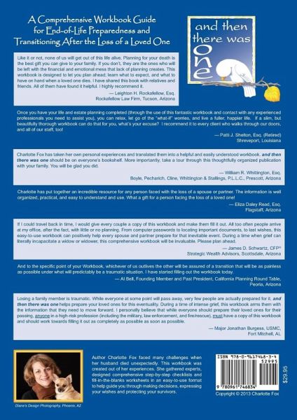 Dying is a serious and complicated business. Circumstances surrounding the sudden death of the author's husband inspired her to recruit professionals and create a 258-page workbook to use as a guided tour for end-of-life planning and transitioning after the loss of a loved one. It is an all-in-one-place to map out wishes and list legal and financial affairs. The comprehensive step-by-step checklists and fill-in-the-blanks worksheets that are in an easy-to-use format, will help guide you through making decisions, expressing your wishes, encourage conversation, eliminate confusion, ease the transition, and help protect your survivors from injustices and victimization that often occurs upon the death of a loved one. Charlotte invites you to hold her hand as she navigates you through this process.