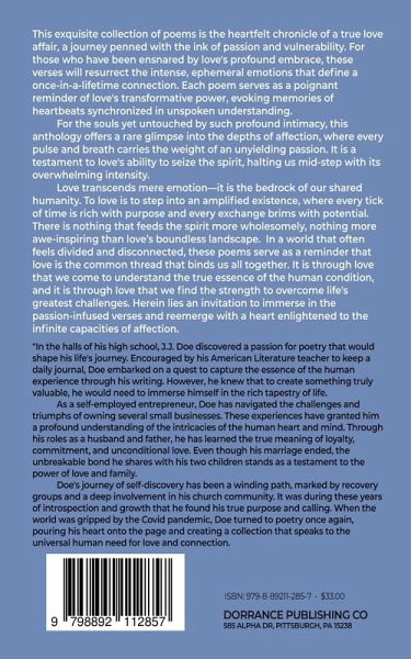 This exquisite collection of poems is the heartfelt chronicle of a true love affair, a journey penned with the ink of passion and vulnerability. For those who have been ensnared by love's profound embrace, these verses will resurrect the intense, ephemeral emotions that define a once-in-a-lifetime connection. Each poem serves as a poignant reminder of love's transformative power, evoking memories of heartbeats synchronized in unspoken understanding. For the souls yet untouched by such profound intimacy, this anthology offers a rare glimpse into the depths of affection, where every pulse and breath carries the weight of an unyielding passion. It is a testament to love's ability to seize the spirit, halting us mid-step with its overwhelming intensity. Love transcends mere emotion-it is the bedrock of our shared humanity. To love is to step into an amplified existence, where every tick of time is rich with purpose and every exchange brims with potential. There is nothing that feeds the spirit more wholesomely, nothing more awe-inspiring than love's boundless landscape. In a world that often feels divided and disconnected, these poems serve as a reminder that love is the common thread that binds us all together. It is through love that we come to understand the true essence of the human condition, and it is through love that we find the strength to overcome life's greatest challenges. Herein lies an invitation to immerse in the passion-infused verses and reemerge with a heart enlightened to the infinite capacities of affection. "In the halls of his high school, J.J. Doe discovered a passion for poetry that would shape his life's journey. Encouraged by his American Literature teacher to keep a daily journal, Doe embarked on a quest to capture the essence of the human experience through his writing. However, he knew that to create something truly valuable, he would need to immerse himself in the rich tapestry of life. As a self-employed entrepreneur, Doe has navigated the challenges and triumphs of owning several small businesses. These experiences have granted him a profound understanding of the intricacies of the human heart and mind. Through his roles as a husband and father, he has learned the true meaning of loyalty, commitment, and unconditional love. Even though his marriage ended, the unbreakable bond he shares with his two children stands as a testament to the power of love and family. Doe's journey of self-discovery has been a winding path, marked by recovery groups and a deep involvement in his church community. It was during these years of introspection and growth that he found his true purpose and calling. When the world was gripped by the Covid pandemic, Doe turned to poetry once again, pouring his heart onto the page and creating a collection that speaks to the universal human need for love and connection.