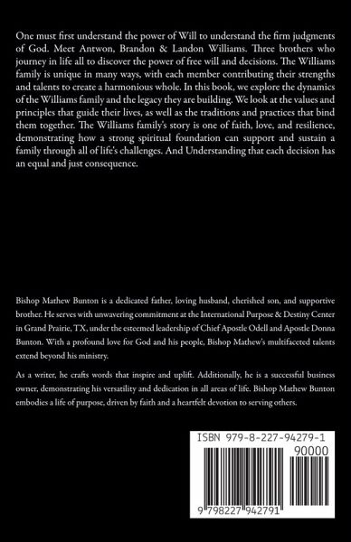 One must first understand the power of Will to understand the firm judgments of God. Meet Antwon, Brandon & Landon Williams. Three brothers who journey in life all to discover the power of free will and decisions. The Williams family is unique in many ways, with each member contributing their strengths and talents to create a harmonious whole. In this book, we explore the dynamics of the Williams family and the legacy they are building. We look at the values and principles that guide their lives, as well as the traditions and practices that bind them together. The Williams family's story is one of faith, love, and resilience, demonstrating how a strong spiritual foundation can support and sustain a family through all of life's challenges. And Understanding that each decision has an equal and just consequence. Dive in as we see the lives and witness the afterlife of these three brothers in hopes to understand the power of the Will that we truely possess.