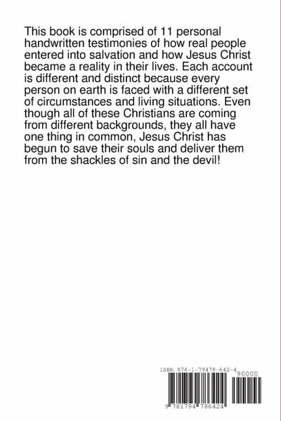 This book is comprised of 11 personal handwritten testimonies of how real people entered into salvation and how Jesus Christ became a reality in their lives. Each account is different and distinct because every person on earth is faced with a different set of circumstances and living situations. Even though all of these Christians are coming from different backgrounds, they all have one thing in common, Jesus Christ has begun to save their souls and deliver them from the shackles of sin and the devil!
