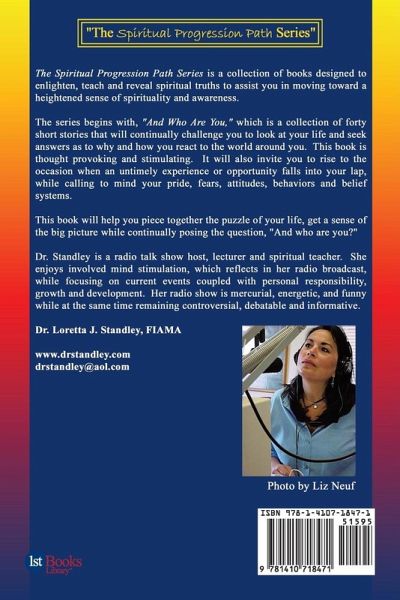 The Spiritual Progression Path Series is a collection of books designed to enlighten, teach and reveal spiritual truths to assist you in moving toward a heightened sense of spirituality and awareness. The series begins with this book, "And Who Are You," which is a collection of forty short stories that will continually challenge you to look at your life and seek answers as to why and how you react to the world around you. Each story is supported by scripture and accompanied with a list of affirmations to reinforce a shift in consciousness. This book is thought provoking and will invite you to rise to the occasion when an untimely experience or opportunity falls into your lap. Every moment in your life is an opportunity for change and advancement while calling to mind your pride, fears, attitudes, behaviors and belief systems. Deep inner probing, answering your questions honestly and gaining clarity of the choices you've made will propel you into a new and exciting direction. This includes spirituality, relationships, career and money. This book will help you piece together the puzzle of your life, get a sense of the big picture while continually posing the question, "And who are you?"