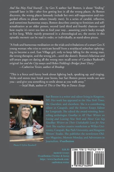 And You May Find Yourself... by Gen-X author Sari Botton, is about "finding" yourself later in life-after first getting lost in all the wrong places. As Botton discovers, the wrong places famously include her own self-suppression and misguided efforts to please others (mostly men). In a series of candid, reflective, sometimes humorous essays, Botton describes coming to feminism and self-actualization as an older person, second (and third and fourth) chances-and how maybe it's never too late to find your way...assuming you're lucky enough to live long. While mainly presented in a chronological arc, the stories in this episodic memoir lend themselves to being read in order, or individually, as stand-alone pieces. "In her edgy, tender, witty way, Sari Botton has written a book for any woman who ever contorted herself to fit culturally imposed ideals, in other words, all of us. In witnessing the ways Sari has fought and failed and flourished, in the poignancy and laughter, there is deep wisdom and an abundance of spirit." -Beverly Donofrio, author of Riding in Cars with Boys "A fresh and humorous meditation on the trials and tribulations of a smart Gen-X young woman who tries to extricate herself from a straitlaced suburban upbringing to become a cool, East Village girl, only to keep falling for the wrong man, the wrong therapist, and the wrong job... until she doesn't. Botton's hilarious and self-aware pages on dating all the wrong men recall some of Candace Bushnell's original Sex and the City essays and Helen Fielding's Bridget Jones' Diary." -Catherine Texier, author of Breakup "A humanizing, humble, and hard look at a life. Investigative journalism of the soul. Sari Botton's And You May Find Yourself is like the older sister of My Misspent Youth by Meghan Daum. You will absolutely find yourself in this intelligent, clever, and clear-hearted book." -Chloe Caldwell, author of The Red Zone: A Love Story "This is a fierce and funny book about fighting back, speaking up, and singing. Sticks and stones may break your bones, but Sari Botton proves words can save you-and give you something to smile about as you walk away." -Sejal Shah, author of This is One Way to Dance: Essays "And You May Find Yourself reminds us that the more specific and particular a person's story is, the more universal it feels. I'm glad Sari Botton solved the mystery of herself and gladder still she was generous enough to share the answer with readers. -Laura Lippman, author of My Life as a Villainess: Essays