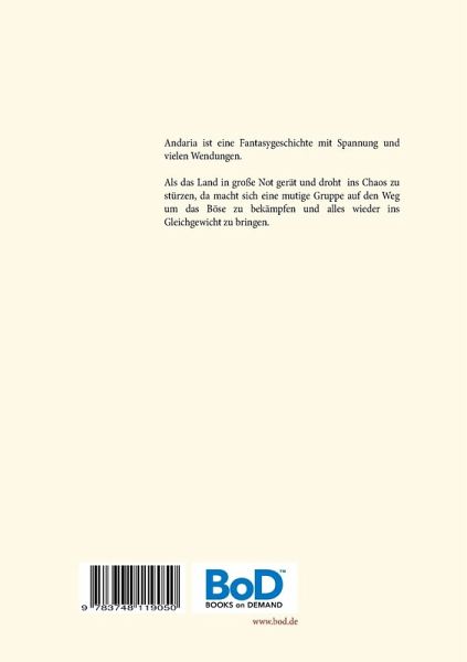 Andaria ist eine Fantasygeschichte mit Spannung und vielen Wendungen.Als das Land in große Not gerät und droht ins Chaos zu stürzen, da macht sich eine mutige Gruppe auf den Weg um das Böse zu bekämpfen und alles wieder ins Gleichgewicht zu bringen.