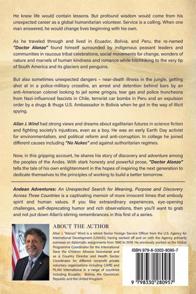 Revised and Updated Second Edition Life is all about Surviving the Lessons and Growing from Them. Shot at, arrested, threatened and endangered - Author Allan J. Wind survived incredible and unexpected dangers as a global humanitarian volunteer and lived to share the powerful lessons he learned on his travels. Suppose you're struggling to find inspiration and motivation because of the challenging events in the world. In that case, this book reminds you that there are many remarkable stories of people who do care and whose generosity is changing the world. Service is a calling - and a challenge for us. From Brooklyn New York to the Andes Mountains, you'll get a front seat to the incredible stories as the author traveled and lived in Ecuador, Bolivia, and Peru. "Doctor Alonzo" - as he was newly nicknamed - found himself surrounded by indigenous peasant leaders and communities in raucous tribal celebrations, social movements for change, wonders of nature and marvels of human kindness and romance while hitchhiking to the very tip of South America and its glaciers and penguins. Along the way, there were unexpected dangers - near-death illness in the jungle, getting shot at in a police-military crossfire, an arrest and detention behind bars by an anti-American colonel looking to jail some gringos, tear gas and police truncheons from Nazi-influenced fascists in Chile, terrorist car bombs in Peru and an expulsion order by a drugs & thugs U.S. Ambassador in Bolivia when he got in the way of illicit spying. "Doctor Alonzo" candidly shares his story of discovery and adventure among the peoples of the Andes. With simple honesty, "Doctor Alonzo" tells the tale of his own enlightenment to inspire others to be of service and for the next generation to dedicate themselves to the principles of working to build a better tomorrow. Here you will find storytelling interwoven with a memoir of public health, community development service, and spiritual discovery overseas in Peace Corps and nongovernmental organizations and USAID, sharing with self-deprecating humor, his unusual experiences across the Andes and Latin America. Full of anecdotes and some remarkable stories from different South American countries. You will find reflections as well on the role and place for foreign aid, on religion, and on other topics many of us spend time questioning and dealing with. For some, a provocative discussion and meditation on searching for meaning and purpose after college. A story of successes, failures, redemption, challenges, faith, and perseverance. If you'd like to be uplifted and transported to other exotic lands in the first of a series of adventures, let's begin our journey together.