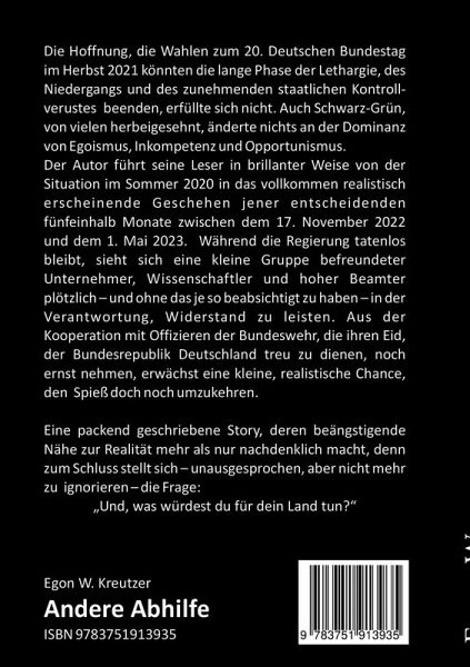 Die vage Hoffnung, das Ergebnis der Wahlen zum 20. Deutschen Bundestag im Herbst 2021 würde einen Politikwechsel ermöglichen und die lange Phase der Lethargie, der Auflösung der öffentlichen Ordnung und des wirtschaftlichen und sozialen Niedergangs beenden, hatte sich nicht erfüllt. Schwarz-Grün, von vielen herbeigesehnt, erwies sich nur als nochmalige Steigerung einer unseligen Allianz aus Egoismus, Inkompetenz und blankem Opportunismus.Der Autor führt seine Leser in brillanter Weise von der aktuellen Situation im Sommer 2020 in das vollkommen realistisch erscheinende Geschehen jener entscheidenden fünfeinhalb Monate zwischen dem 17. November 2022 und dem 1. Mai 2023.Die Regierung sieht den immer aggressiver werdenden Angriffen anonymer Global Player unbeeindruckt und tatenlos zu. Eine kleine Gruppe befreundeter Unternehmer, Wissenschaftler und hoher Beamter sieht sich plötzlich - und ohne das je beabsichtigt zu haben - in der Verantwortung, Widerstand zu leisten. Doch erst aus der Kooperation mit Offizieren der Bundeswehr, die trotz der immer grotesker werdenden Säuberungswellen ihren Eid, der Bundesrepublik Deutschland treu zu dienen, noch ernst nehmen, lässt eine kleine, realistische Chance entstehen, den Spieß doch noch umzudrehen.Eine packend geschriebene Story, deren beängstigende Nähe zur Realität mehr als nur nachdenklich macht, denn zum Schluss stellt sich - unausgesprochen, aber nicht mehr zu ignorieren - die Frage:"Und, was würdest du für dein Land tun?"