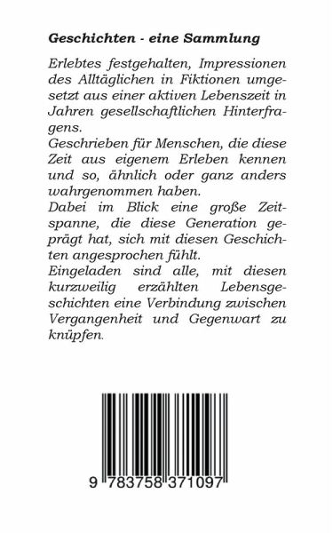 Geschichten - eine SammlungErlebtes festgehalten, Impressionen des Alltäglichen in Fiktionen umgesetzt, aus einer aktiven Lebenszeit in Jahren gesellschaftlichen Hinterfragens. Geschrieben für Menschen, die diese Zeit aus eigenem Erleben kennen und so, ähnlich oder ganz anders wahrgenommen haben. Dabei im Blick eine große Zeitspanne, die diese Generation geprägt hat, sich mit diesen Geschichten angesprochen fühlt. Eingeladen sind alle, mit diesen kurzweilig erzählten Lebensgeschichten eine Verbindung zwischen Vergangenheit und Gegenwart zu knüpfen.