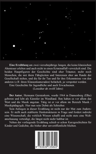 Eine Erzählung um zwei vierzehnjährige Jungen, die keine klassischen Abenteuer erleben und auch nicht in einen Kriminalfall verwickelt sind. Die beiden Hauptfiguren der Geschichte sind eher Träumer, mehr noch Menschen, die mit ihren Fähigkeiten und Interessen eher am Rande der Gesellschaft stehen, und die für ihr Tun und für ihre Erkenntnisse von den anderen (z.B. ihren Klassenkameraden) belächelt, ja verspottet werden.Eine Geschichte für Jugendliche und auch Erwachsenen. (Lesealter ab zwölf Jahre)