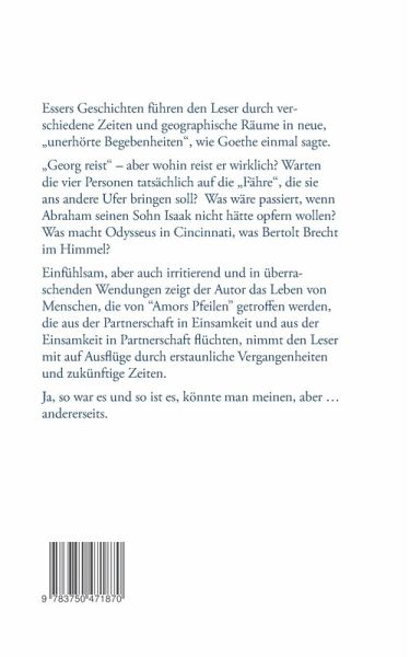 Essers Geschichten führen den Leser durch verschiedene Zeiten und geographische Räume in neue, "unerhörte Begebenheiten", wie Goethe einmal sagte. "Georg reist" - aber wohin reist er wirklich? Warten die vier Personen tatsächlich auf die "Fähre", die sie ans andere Ufer bringen soll? Was wäre passiert, wenn Abraham seinen Sohn Isaak nicht hätte opfern wollen? Was macht Odysseus in Cincinnati, was Bertolt Brecht im Himmel?Einfühlsam, aber auch irritierend und in überraschenden Wendungen zeigt der Autor das Leben von Menschen, die von "Amors Pfeilen" getroffen werden, die aus der Partnerschaft in Einsamkeit und aus der Einsamkeit in Partnerschaft flüchten, nimmt den Leser mit auf Ausflüge durch erstaunliche Vergangenheiten und zukünftige Zeiten.Ja, so war es und so ist es, könnte man meinen, aber ... andererseits.