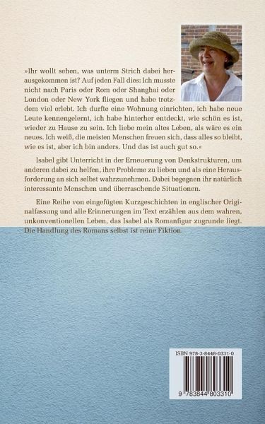 »Ihr wollt sehen, was unterm Strich dabei herausgekommen ist? Auf jeden Fall dies: Ich musste nicht nach Paris oder Rom oder Shanghai oder London oder New York fliegen und habe trotzdem viel erlebt. Ich durfte eine Wohnung einrichten, ich habe neue Leute kennengelernt, ich habe hinterher entdeckt, wie schön es ist, wieder zu Hause zu sein. Ich liebe mein altes Leben, als wäre es ein neues. Ich weiß, die meisten Menschen freuen sich, dass alles so bleibt, wie es ist, aber ich bin anders. Und das ist auch gut so.« Isabel gibt Unterricht in der Erneuerung von Denkstrukturen, um anderen dabei zu helfen, ihre Probleme zu lieben und als eine Herausforderung an sich selbst wahrzunehmen. Dabei begegnen ihr natürlich interessante Menschen und überraschende Situationen. Eine Reihe von eingefügten Kurzgeschichten in englischer Originalfassung und alle Erinnerungen im Text erzählen aus dem wahren, unkonventionellen Leben, das Isabel als Romanfigur zugrunde liegt. Die Handlung des Romans selbst ist reine Fiktion.