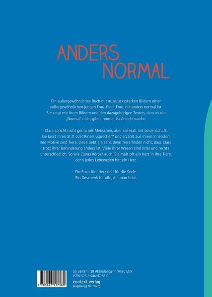 Ein außergewöhnliches Buch mit ausdrucksstarken Bildern einer außergewöhnlichen jungen Frau. Einer Frau, die anders normal ist. Sie zeigt mit ihren Bildern und den dazugehörigen Texten, dass es ein "Normal" nicht gibt - normal ist Ansichtssache.Clara spricht nicht gerne mit Menschen, aber sie malt mit Leidenschaft. Sie lässt ihren Stift oder Pinsel "sprechen" und erzählt aus ihrem Innersten. Ihre Motive sind Tiere, diese liebt sie sehr, denn Tiere finden nicht, dass Clara, trotz ihrer Behinderung anders ist. Viele ihrer Wesen sind links und rechts unterschiedlich. So wie Claras Körper auch. Sie malt oft ein Herz in ihre Tiere, denn jedes Lebewesen hat ein Herz.Ein Buch fürs Herz und für die Seele.Ein Geschenk für alle, die man liebt.