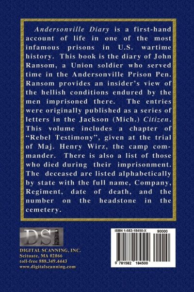 John Ransom's Andersonville Diary is a first hand account of life in one of the most infamous prisons in U.S. wartime history. This book is the diary of John Ransom, a Union soldier who served time in the Andersonville Prison Pen. Ransom provides an insiders view of the hellish conditions endured by the men imprisoned there. The entries were originally published in the Jackson (Mich.) Citizen. This volume includes a chapter of Rebel Testimony, given during the trial of Maj. Henry Wirz, the camp commander. There is also a list of those who died during their imprisonment. The deceased are listed alphabetically by state with the full name, Company, Regiment, date of death and the number on the headstone in the cemetery.