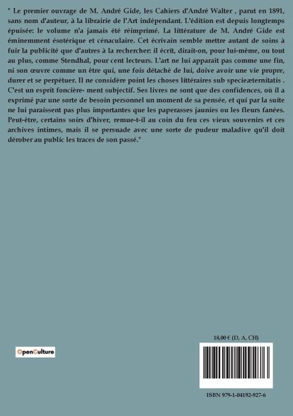 " Le premier ouvrage de M. André Gide, les Cahiers d'André Walter , parut en 1891, sans nom d'auteur, à la librairie de l'Art indépendant. L'édition est depuis longtemps épuisée: le volume n'a jamais été réimprimé. La littérature de M. André Gide est éminemment ésotérique et cénaculaire. Cet écrivain semble mettre autant de soins à fuir la publicité que d'autres à la rechercher: il écrit, dirait-on, pour lui-même, ou tout au plus, comme Stendhal, pour cent lecteurs. L'art ne lui apparaît pas comme une fin, ni son ¿uvre comme un être qui, une fois détaché de lui, doive avoir une vie propre, durer et se perpétuer. Il ne considère point les choses littéraires sub specieæternitatis . C'est un esprit foncière- ment subjectif. Ses livres ne sont que des confidences, où il a exprimé par une sorte de besoin personnel un moment de sa pensée, et qui par la suite ne lui paraissent pas plus importantes que les paperasses jaunies ou les fleurs fanées. Peut-être, certains soirs d'hiver, remue-t-il au coin du feu ces vieux souvenirs et ces archives intimes, mais il se persuade avec une sorte de pudeur maladive qu'il doit dérober au public les traces de son passé."