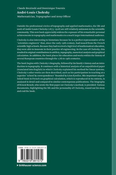 "A nicely illustrated book, many photographs appear of Cholesky, often in military uniform, his family, colleagues and contemporaries. The topographical terms and techniques are well described ... . Cholesky was very practical and resourceful. ... A very stimulating and engaging book, a motivation to further research of the techniques considered." (Wallace A. Ferguson, Mathematics Today, Vol. 52 (2), April, 2016)