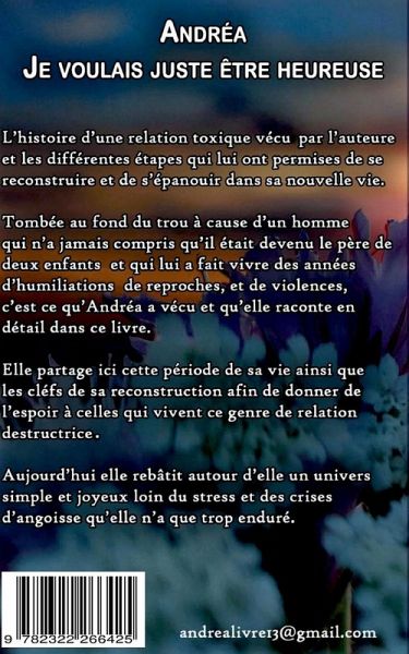 L'histoire d'une relation toxique vécue par l'auteure,et les différentes étapes qui lui ont permises de se reconstruireet de s'épanouir dans sa nouvelle vie.Tombée au fond du trou à cause d'un hommequi na jamais compris qu'il était devenu le père de deux enfantset qui lui a fait vivre des années d'humiliations, de reproches et de violences.C'est ce qu'Andréa a vécu et qu'elle raconte en détail dans ce livre.Elle partage ici cette période de sa vie ainsi que les clefs de sa reconstruction, afin de donner de l'espoir à celles qui vivent ce genre de relation destructrice.Aujourd'hui elle rebâtit autour d'elle un univers simple et joyeux, loin du stress et des crises d'angoisse qu'elle n'a que trop enduré.