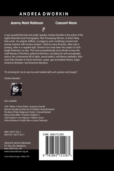 ANDREA DWORKIN Of this study of her work, Andrea Dworkin wrote: It's amazing for me to see my work treated with such passion and respect. There is nothing resembling it in the U.S. in relation to my work. Michael Moorcock wrote of American feminist and writer Andrea Dworkin: 'I think feminism is the most important political movement of our times. People think Andrea's a man-hater. She gets called a Fascist and a Nazi - particularly by the American left, but it's not detectable in her work. To me she seemed like a pussycat... She has an extraordinary eloquence, a kind of magic that moves people'. Dworkin is a very positive writer, always driving onwards for revolution, change and radical thinking. In the introduction to Letters From a War Zone, she writes: 'I am more reckless now than when I started out because I know what everything costs and it doesn't matter. I have paid a lot to write what I believe to be true. On one level, I suffer terribly from the disdain that much of my work has met. On another, deeper level, I don't give a fuck'. Dworkin's life's work balances the individual suffering of the writer with the larger, worldwide suffering of women's subordination, so that, she says, one becomes, on a personal level, immune to pain, while on the larger, global level, the pain of women and children around the world continues to grow, and continues to make her madder and madder: 'I wrote them [essays and speeches] because I believe in writing, in its power to right wrongs, to change how people see and think, to change how and what people know, to change how and why people act. I wrote them out of the conviction, Quaker in origin, that one must speak truth to power. This is the basic premise in my work as a feminist: activism or writing'. Here Dworkin posits her work as a crusade, that's the newspaper term for her kind of polemic, a 'crusade' against silence and violence, against cruelty and inequality, and certainly Dworkin is often portrayed in the media as a crusader, someone who really believes in herself, in her convictions, someone wholly committed, as few others are, to a radical change. Michael Moorcock, in his piece on Andrea Dworkin (New Statesman, 1988) writes: [w]hat she fights against, in everything she writes and does, is male refusal to acknowledge sexual inequality, male hatred of women, male contempt for women, male power'.