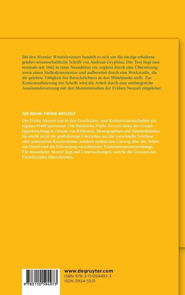 "Mumiae Wratislavienses" ist die einzige erhaltene gelehrt-wissenschaftliche Schrift des Barockliteraten. Mit dem vorliegenden Band liegt der Text nun erstmals in einer Neuedition vor. Er wird ergänzt durch eine Übersetzung sowie einen Stellenkommentar und in einer Werkstudie aufbereitet, die Gryphius' gelehrte Tätigkeit in den Fokus stellt. Zur Kontextualisierung des Werkes wird die Arbeit durch eine umfangreiche Auseinandersetzung mit den Mumienstudien der Frühen Neuzeit eingeleitet.