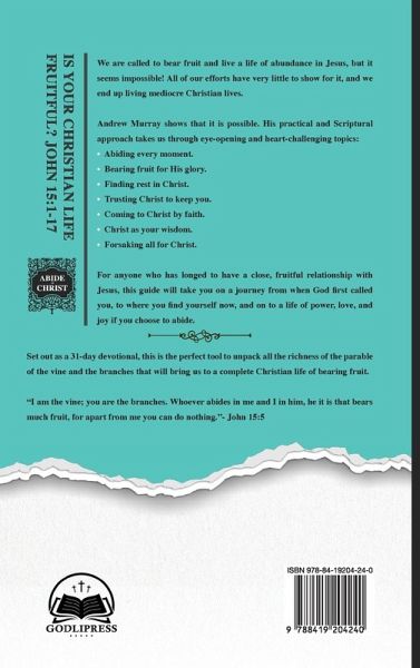 Is your Christian life fruitful? John 15:1-17 We are called to bear fruit and live a life of abundance in Jesus, but it seems impossible! All of our efforts have very little to show for it, and we end up living mediocre Christian lives. Andrew Murray shows that it is possible. His practical and Scriptural approach takes us through eye-opening and life-changing topics:Abiding every moment. Bearing fruit for His glory. Finding rest in Christ. Trusting Christ to keep you. Coming to Christ by faith. Christ as your wisdom. Forsaking all for Christ. ¿ For anyone who has longed to have a close, fruitful relationship with Jesus, this guide will take you on a journey from when God first called you, to where you find yourself now, and on to a life of power, love, and joy if you choose to abide. Set out as a 31-day devotional, this is the perfect tool to unpack all the richness of the parable of the vine and the branches that will bring us to a complete Christian life of bearing fruit. "I am the vine; you are the branches. Whoever abides in me and I in him, he it is that bears much fruit, for apart from me you can do nothing."- John 15:5