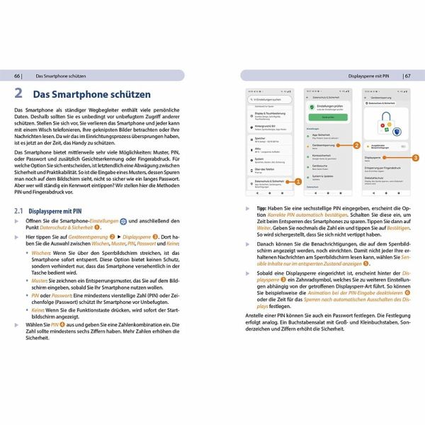 Alle Bedienelemente Ihres Android 15-Smartphones auf einen BlickErsteinrichtung und Tipps zum UmzugGoogle-Konto erstellen und verwaltenDie Benutzeroberfläche Ihres Smartphones personalisierenApps aus dem Play Store herunterladenKontakte anlegen und im Adressbuch verwaltenAnrufe tätigen und SMS austauschen Nachrichten über Mail & WhatsApp versenden / empfangenUhr, Kalender, Maps und andere praktische Apps nutzen Fotos sowie Videos aufnehmen, verwalten und teilenIns Internet gehen über WLAN und mobile Daten Updates, Datenschutz und Sicherheit