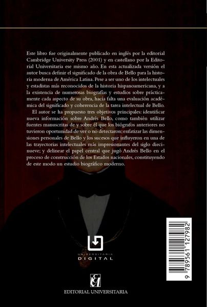 Este libro fue originalmente publicado en inglés por la editorial Cambridge University Press (2001) y en castellano por la Editorial Universitaria ese mismo año. En esta actualizada versión el autor busca definir el significado de la obra de Bello para la historia moderna de América Latina. Pese a ser uno de los intelectuales y estadistas más reconocidos de la historia hispanoamericana, y a la existencia de numerosas biografías y estudios sobre prácticamente cada aspecto de su obra, hacía falta una evaluación académica del significado y coherencia de la tarea intelectual de Bello. El autor se ha propuesto tres objetivos principales: identificar nueva información sobre Andrés Bello, como también utilizar fuentes manuscritas de y sobre él que los biógrafos anteriores no tuvieron oportunidad de ver o no detectaron; enfatizar las dimensiones personales de Bello y los sucesos que influyeron en una de las trayectorias intelectuales más impresionantes del siglo diecinueve; y delinear el papel central que jugó Andrés Bello en el proceso de construcción de los Estados nacionales, constituyendo de este modo un estudio biográfico moderno.