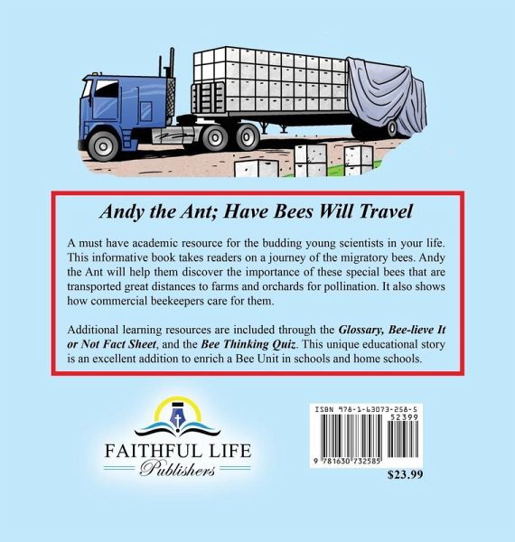 A must have academic resource for the budding young scientists in your life. This informative book takes readers on a journey of the migratory bees. Andy the Ant will help them discover the importance of these special bees that are transported great distances to farms and orchards for pollination. It also shows how commercial beekeepers care for them. Additional learning resources are included through the Glossary, Bee-lieve It or Not Fact Sheet, and the Bee Thinking Quiz. This unique educational story is an excellent addition to enrich a Bee Unit in schools and home schools.