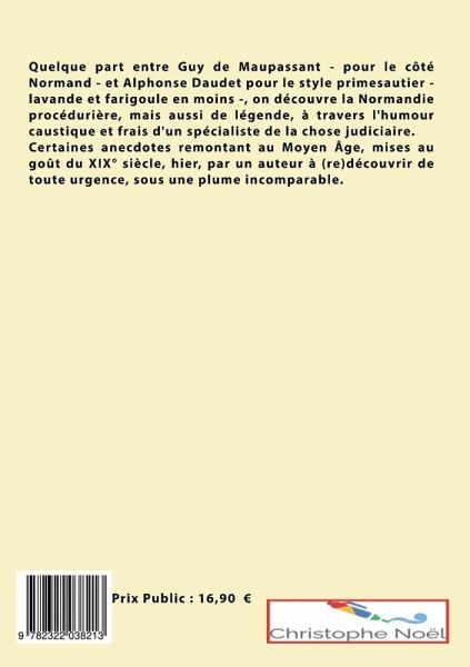 Ce livre n'est pas un simple fac-similé, mais le texte a été entièrement revu, corrigé et annoté.Quelque part entre Guy de Maupassant - pour le côté Normand - et Alphonse Daudet pour le style primesautier - lavande et farigoule en moins -, on découvre la Normandie procédurière, mais aussi de légende, à travers l'humour caustique et frais d'un spécialiste de la chose judiciaire.Certaines anecdotes remontant au Moyen Âge, mises au goût du XIX° siècle, hier, par un auteur à (re)découvrir.de toute urgence, sous une plume incomparable.