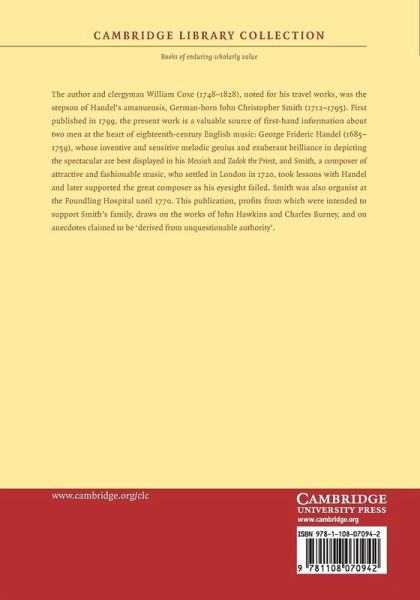 The author and clergyman William Coxe (1748-1828), noted for his travel works, was the stepson of Handel's amanuensis, German-born John Christopher Smith (1712-95). First published in 1799, the present work is a valuable source of first-hand information about two men at the heart of eighteenth-century English music: George Frideric Handel (1685-1759), whose inventive and sensitive melodic genius and exuberant brilliance in depicting the spectacular are best displayed in his Messiah and Zadok the Priest, and Smith, a composer of attractive and fashionable music, who settled in London in 1720, took lessons with Handel and later supported the great composer as his eyesight failed. Smith was also organist at the Foundling Hospital until 1770. This publication, profits from which were intended to support Smith's family, draws on the works of John Hawkins and Charles Burney, and on anecdotes claimed to be 'derived from unquestionable authority'.