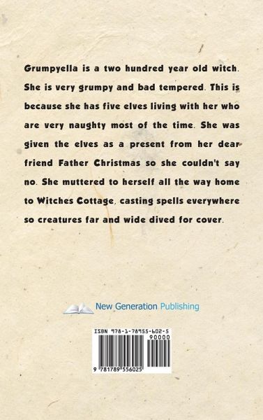 Grumpyella is a two hundred year old witch. She is very grumpy and bad tempered. This is because she has five elves living with her who are very naughty most of the time. She was given the elves as a present from her dear friend Father Christmas so she couldn't say no. She muttered to herself all the way home to Witches Cottage, casting spells everywhere so creatures far and wide dived for cover.