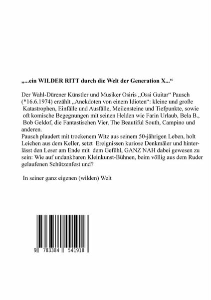 "Anekdoten von einem Idioten" ist Künstlerbiographie, Reise/Tagebuch, Backstage-Roman und vieles mehr...erzählt von einem typischen Vertreter der "Generation X", den verlorenen Kindern und "Flippies". Humorvoll und selbst/ironisch wird hier von Drogenabstürzen, schrägen (Musik) Vögeln, glorreichen Sternstunden und einfach "dumm Gelaufenem" berichtet; trocken und? GUT!
